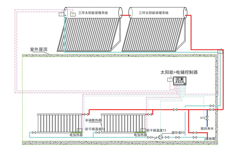 本系統(tǒng)采用3組(或2組)30支太陽(yáng)能采暖機(jī)組,通過(guò)吸收太陽(yáng)能輻射能量將儲(chǔ)水箱內(nèi)的水加熱,當(dāng)太陽(yáng)能溫度達(dá)到采暖設(shè)定值(默認(rèn)值:45℃),啟動(dòng)循環(huán)水泵將熱量運(yùn)送到室內(nèi)采暖末端(暖氣片或地暖),當(dāng)室內(nèi)溫度達(dá)到設(shè)定溫度(默認(rèn)值:16℃)或太陽(yáng)能水箱溫度低于采暖設(shè)定溫度時(shí)循環(huán)泵停止,該系統(tǒng)以太陽(yáng)能熱量采暖為主,電加熱為輔的工作模式,遙控操作使用方便。優(yōu)先使用太陽(yáng)能熱量,當(dāng)太陽(yáng)能溫度不夠時(shí)自動(dòng)切換到電輔加熱模式,太陽(yáng)能溫度恢復(fù)后,自動(dòng)切換到太陽(yáng)能供暖模式。